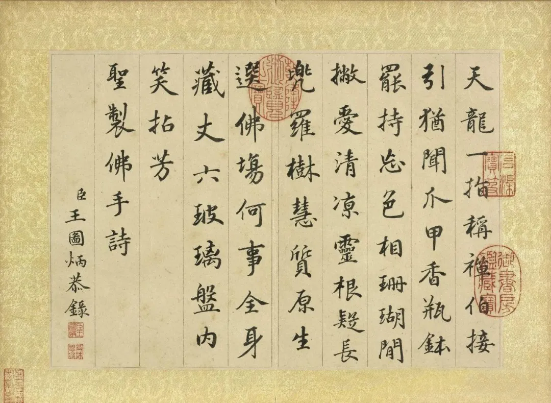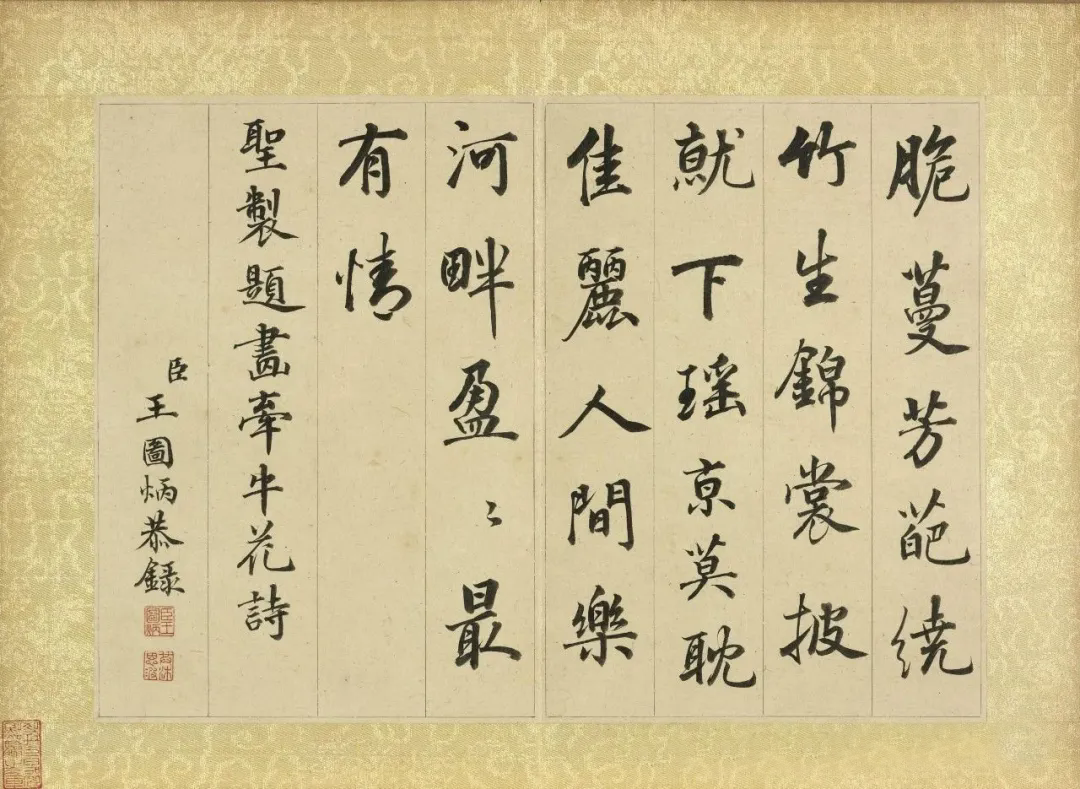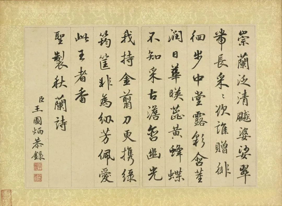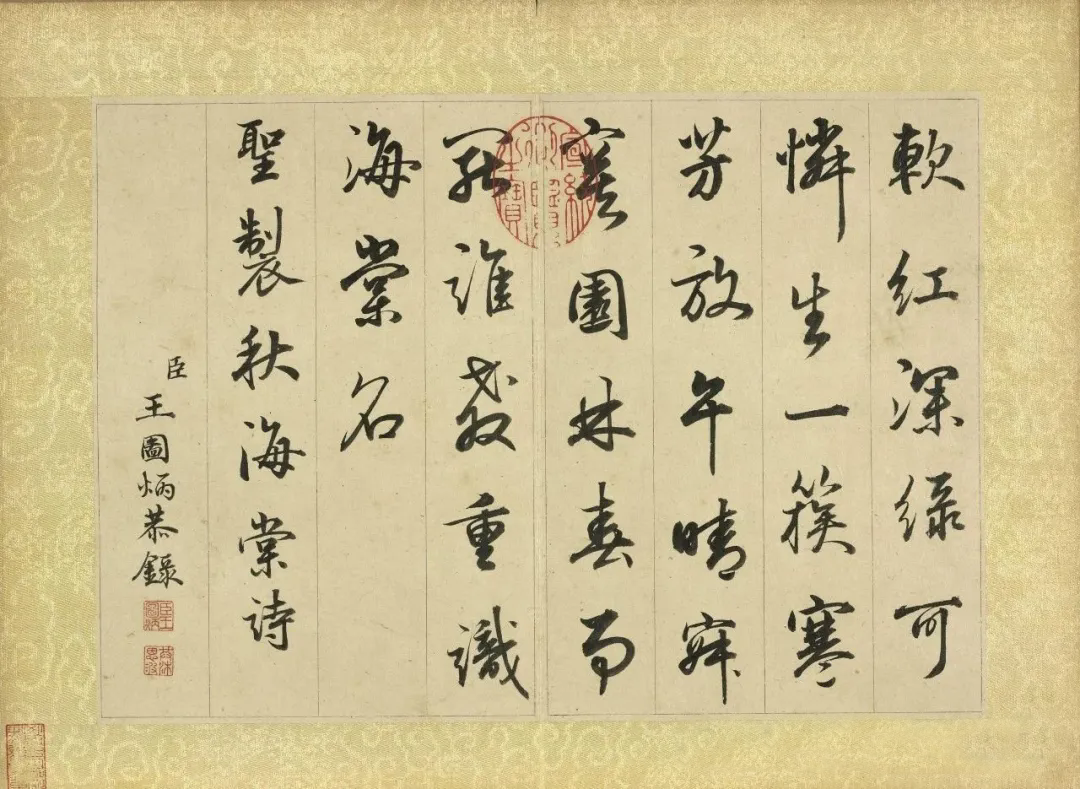 《秋景花卉诗册图》的创作时间虽无确切记载,但从其风格推断,应作于王图炳晚年退隐期间。此时的他已脱离官场纷争,转而追求“笔墨娱情”的艺术境界。册页中“臣王图炳恭录”的款识,既是对皇权的敬畏,亦是对自我身份的确认。这种“仕宦文人”的双重标签,使其作品在清代画坛中独树一帜——既不同于恽寿平“没骨花卉”的纯粹文人趣味,亦区别于余省《种秋花诗意图轴》的宫廷院体风格,形成“雅俗共赏”的独特美学价值。