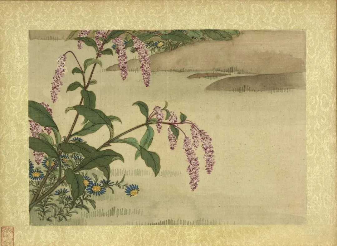 《秋景花卉诗册图》以册页形式呈现,每幅画面均配以御制诗或自作诗。如“寒波澹无痕,秋日悬光晶。离离红蓼花,夹岸纷纵横”的题诗,将秋水的澄澈、红蓼的繁茂与光影的变幻凝练于笔端。王图炳以工笔勾勒花卉形态,红蓼垂穗的动态、蒹葭白羽的质感皆纤毫毕现,而诗中“满目含秋情”的抒怀,则赋予画面以情感温度。这种“诗画互文”的创作模式,既延续了宋代《百花图卷》的工笔传统,又融入了明代文人画“以诗入画”的写意精神,形成“工而不匠,细而不腻”的审美特质。